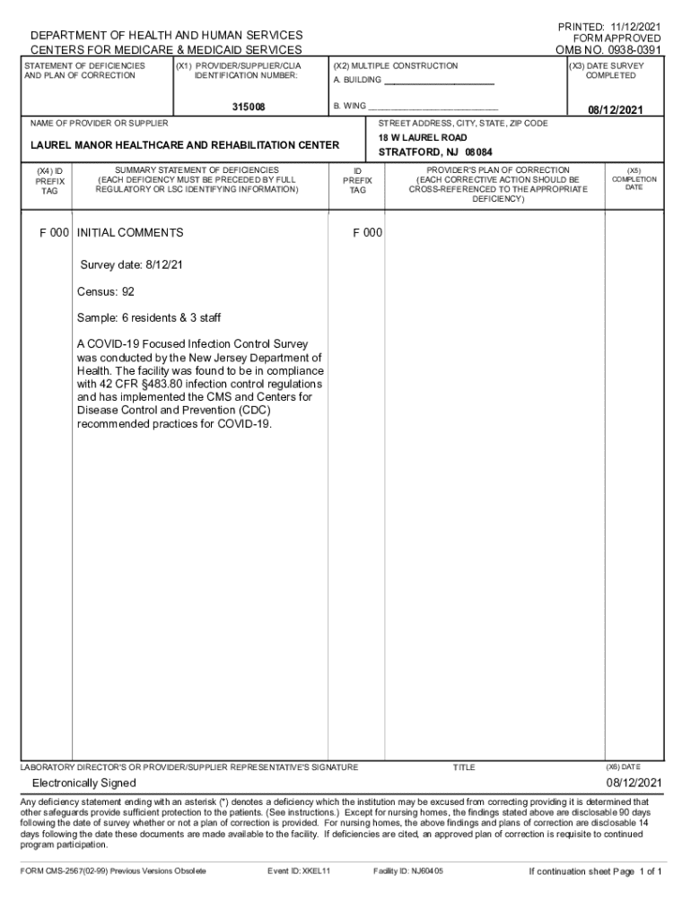 PRINTED: 11/12/2021 FORM APPROVEDDEPARTMENT OF HEALTH AND HUMAN SERVICES CENTERS FOR MEDICARE & MEDICAID SERVICES STATEMENT OF DEFICIENCIES AND PLAN OF CORRECTION(X1) PROVIDER/SUPPLIER/CLIA IDENTIFICATION