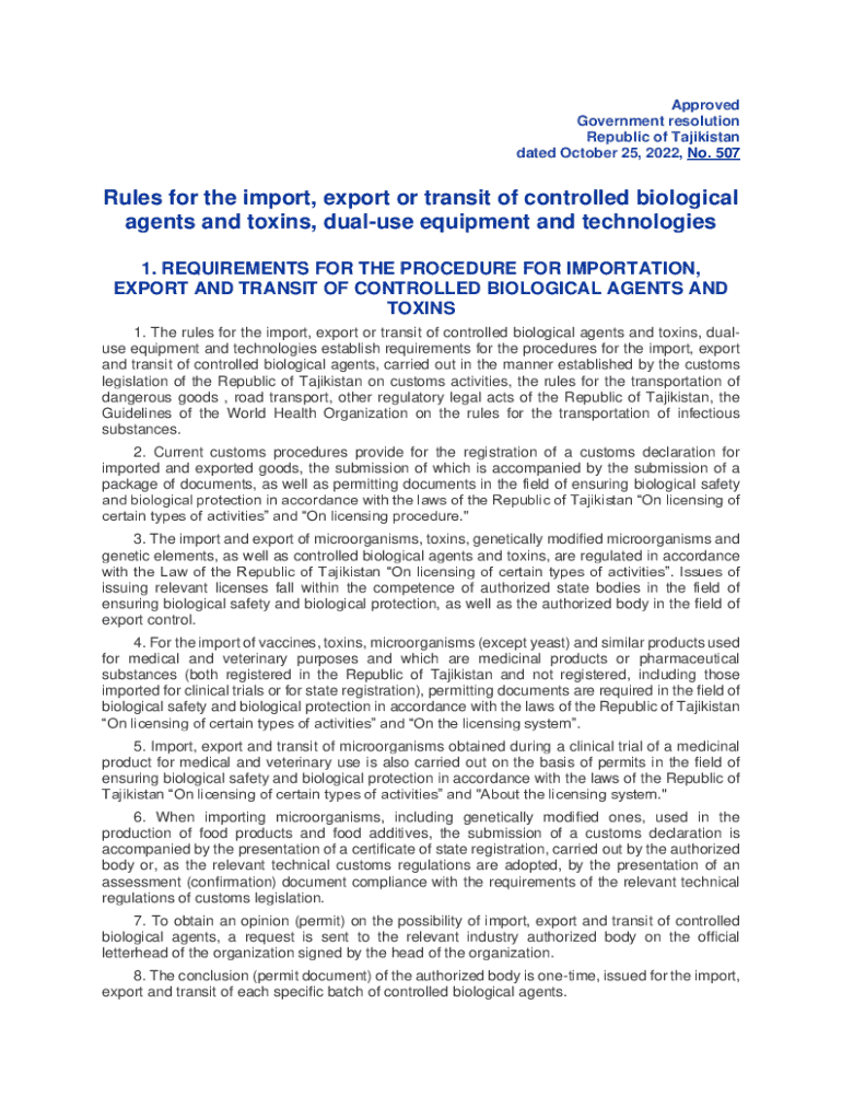 Approved Government resolution Republic of Tajikistan dated October 25, 2022, No. 507Rules for the import, export or transit of controlled biological agents and toxins, dualuse equipment and technologies