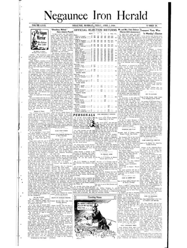 This edition of the Negaunee Iron Herald covers various local news, including updates on town activities, community events, upcoming elections, and highlights about residents. It discusses the deaths of local figures, changes in public office, and community gatherings. The implication of the challenges seen in unemployment, social dynamics, and the essence of community life in Negaunee are explored.