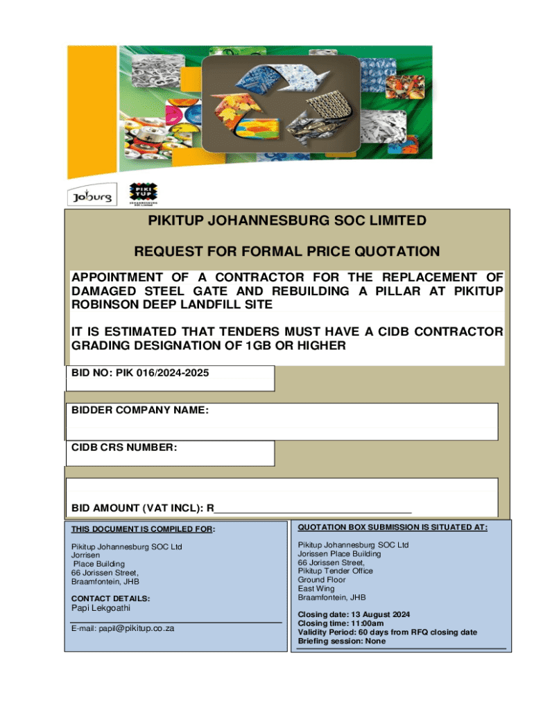 PIKITUP JOHANNESBURG SOC LIMITED REQUEST FOR FORMAL PRICE QUOTATION APPOINTMENT OF A CONTRACTOR FOR THE REPLACEMENT OF DAMAGED STEEL GATE AND REBUILDING A PILLAR AT PIKITUP ROBINSON DEEP LANDFILL