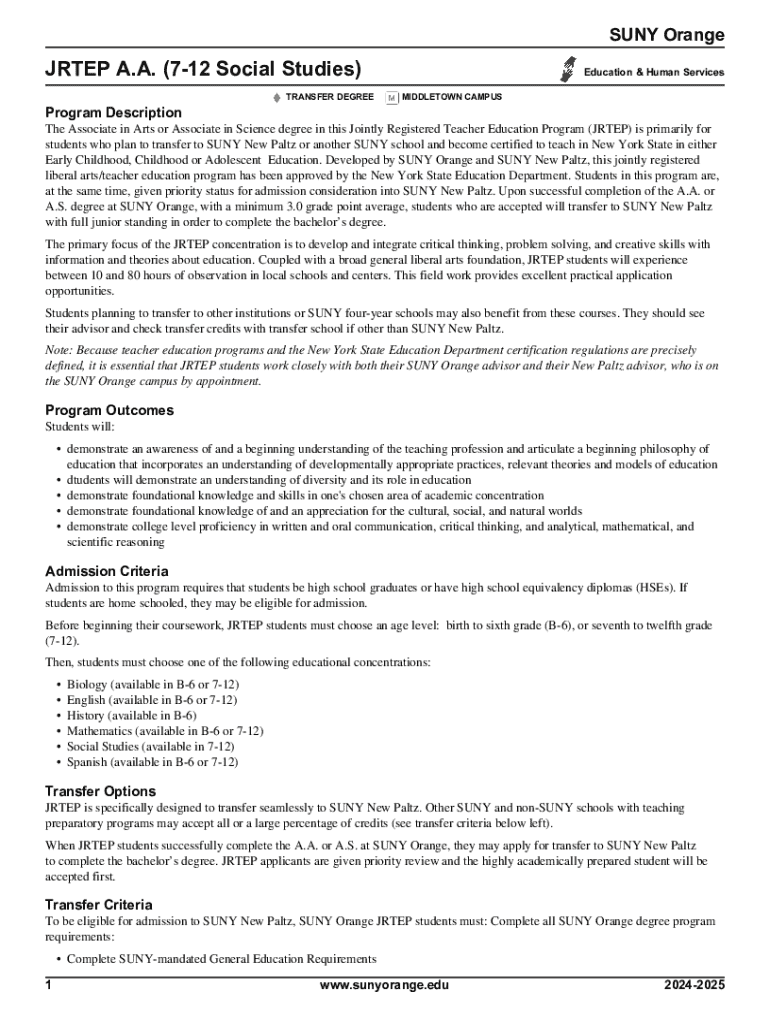The Associate in Arts degree in the Jointly Registered Teacher Education Program (JRTEP) at SUNY Orange is designed for students who aim to transfer to SUNY New Paltz or another SUNY institution to become certified teachers in New York State. The program emphasizes the integration of critical thinking and educational theory, providing both a robust liberal arts foundation and practical classroom experience through field observations.
