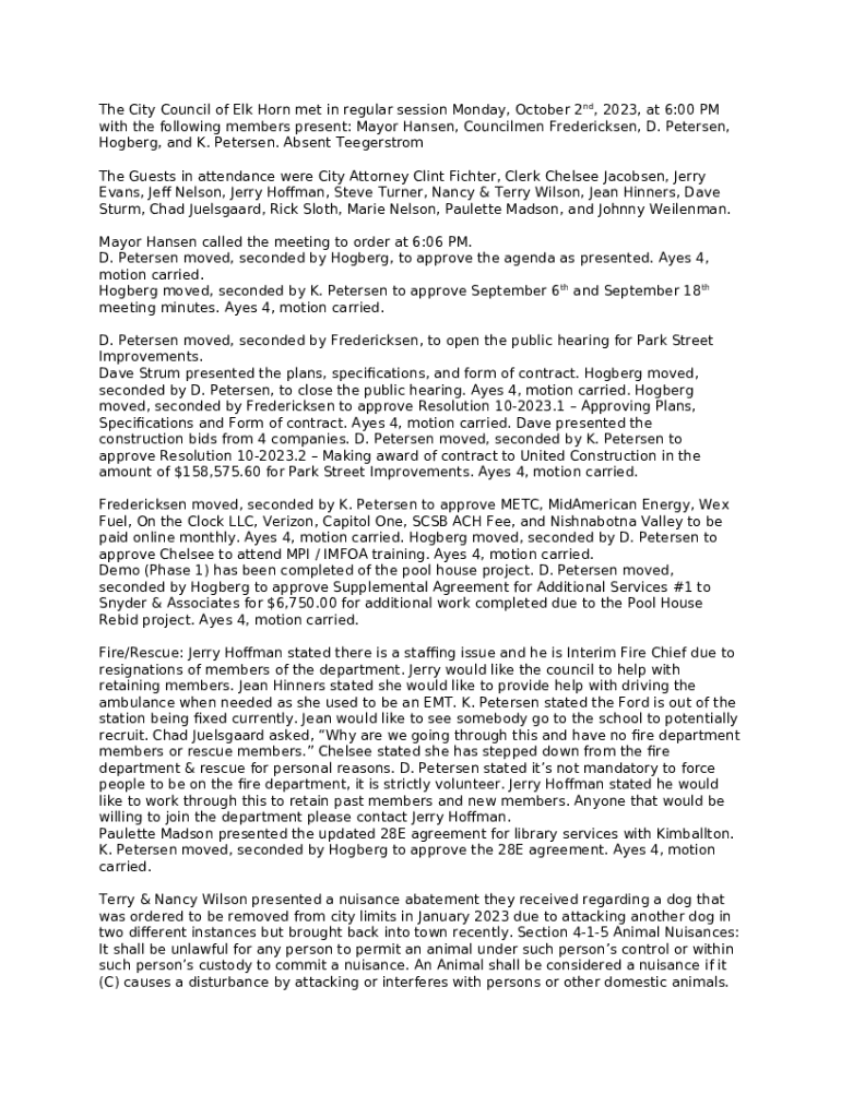 The City Council Meeting Minutes is a fillable form in MS Word extension that should be submitted to the required address in order to provide specific info. It must be filled-out and signed, which may be done manually in hard copy, or with the help of a particular software such as PDFfiller. It helps to complete any PDF or Word document directly in your browser, customize it according to your needs and put a legally-binding electronic signature. Once after completion, you can easily send the City Council Meeting Minutes to the appropriate receiver, or multiple individuals via email or fax. The editable template is printable as well thanks to PDFfiller feature and options proposed for printing out adjustment. In both electronic and physical appearance, your form will have a clean and professional outlook. You can also turn it into a template for further use, without creating a new document from scratch. All that needed is to customize the ready template.