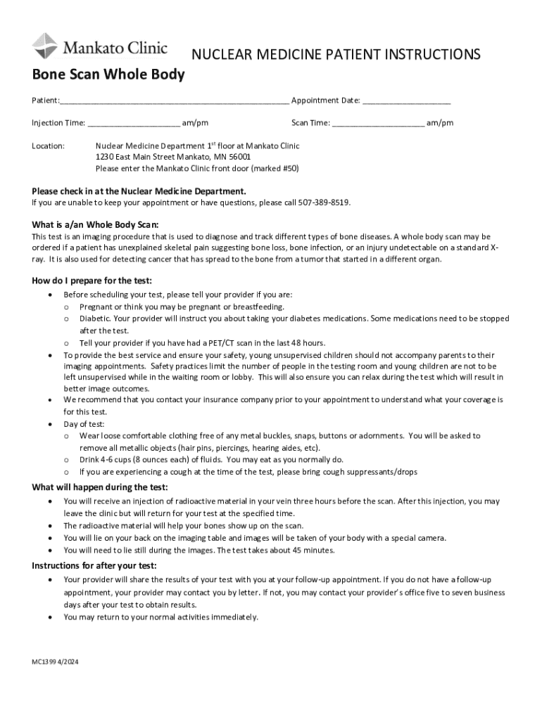 This document provides detailed instructions for patients undergoing a whole body bone scan, including preparation steps, what to expect during the test, and post-test guidelines. It aims to ensure patient safety and provide clarity on the imaging procedure used to diagnose bone diseases.