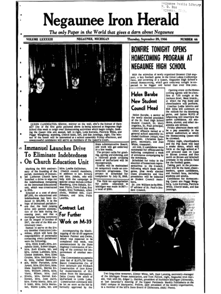 hriQSavnae TJPublic Library0. B o xN e g a u n e e Iron H era ld The only Paper in the World that gives a darn about Negaunee VOLUM E LX X X X IIIN EG A U N EE, M ICHIG ANThursday) September 29t 1966N