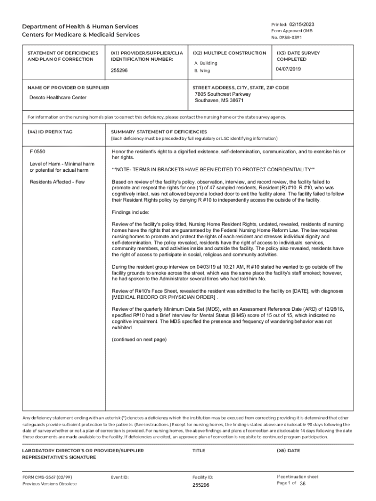 This document outlines the deficiencies identified in the nursing home survey conducted by the Centers for Medicare & Medicaid Services (CMS) on April 7, 2019, regarding residents\' rights, safety, care planning, and the implementation of care protocols. It includes specific failures, such as neglect and abuse allegations, improper assessment and care plan execution, and violations of food service regulations. The report aims to ensure that the nursing home facility adheres to federal...