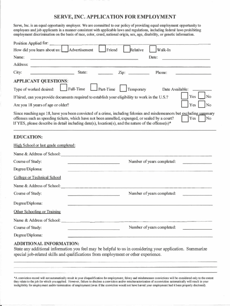 This document is an application form for employment at Serve, Inc., detailing the company’s equal opportunity employment policy, applicant questions, education background, employment history, and required verifications for eligibility to work.