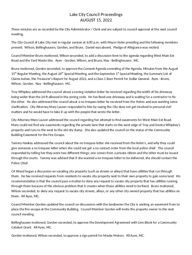 Instructions for the with Mayor Holm presiding and the following members present:Wilson, Bellinghausen, Gorden, and Bruns form