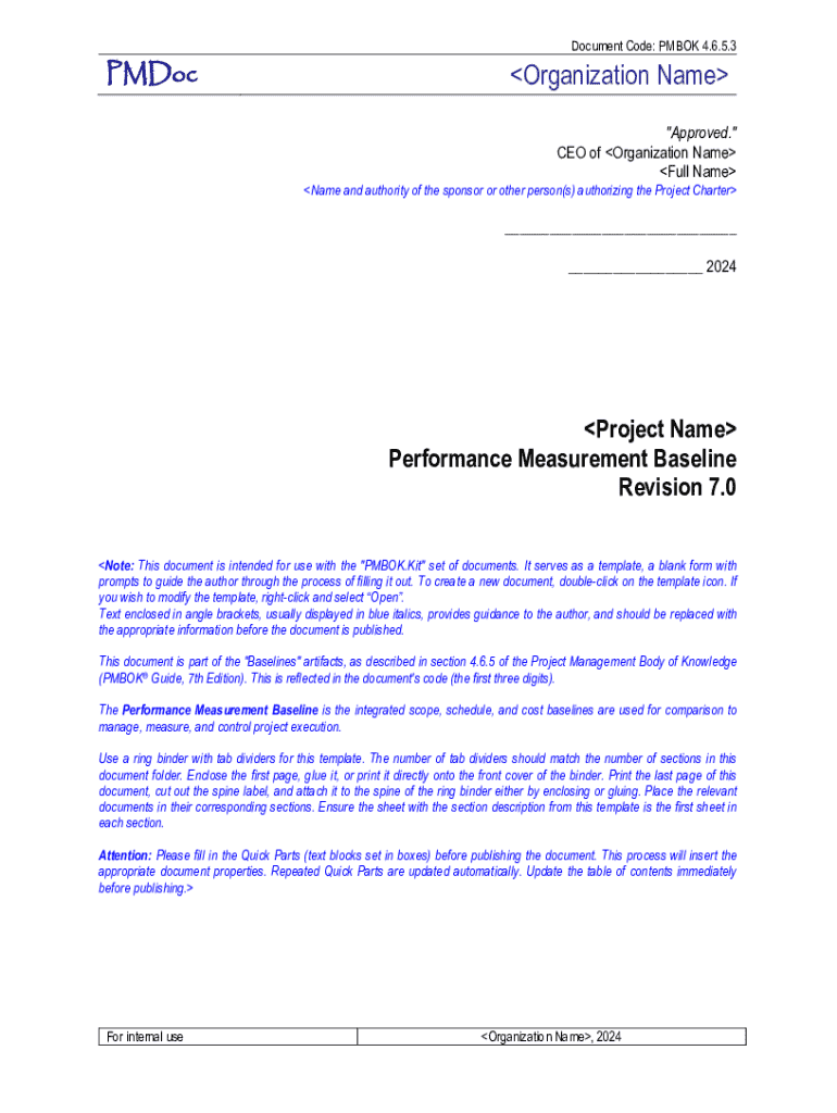 This document serves as a template for a Performance Measurement Baseline aligned with PMBOK guidelines. It outlines the integration of scope, schedule, and cost baselines to manage and measure project execution effectively. The document includes guidance for filling out necessary information, and is intended for use within the specific organization for project management purposes.