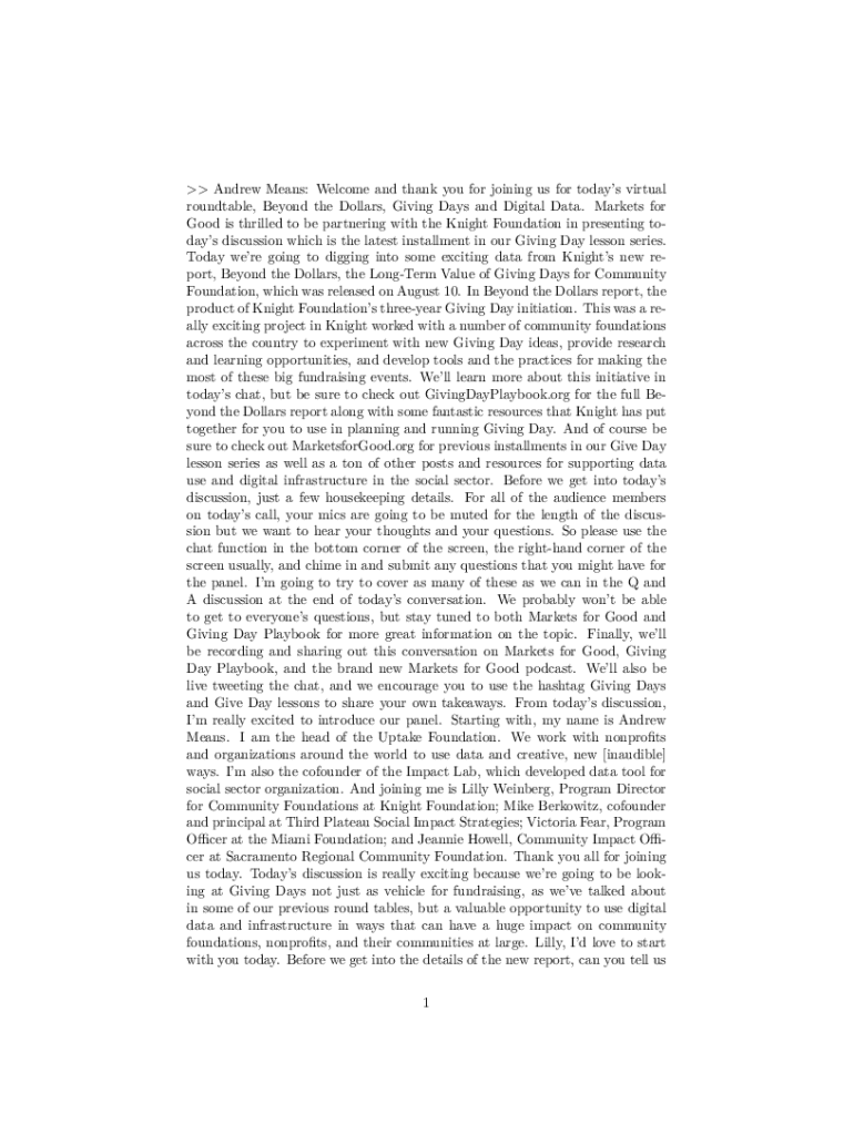 This document details a virtual roundtable discussion focused on the findings of the Knight Foundation\'s report \'Beyond the Dollars\', which explores the long-term impact of Giving Days for community foundations. The roundtable features expert panelists discussing insights into the value of Giving Days beyond fundraising, including community engagement, digital infrastructure, and strategies for nonprofit capacity building.