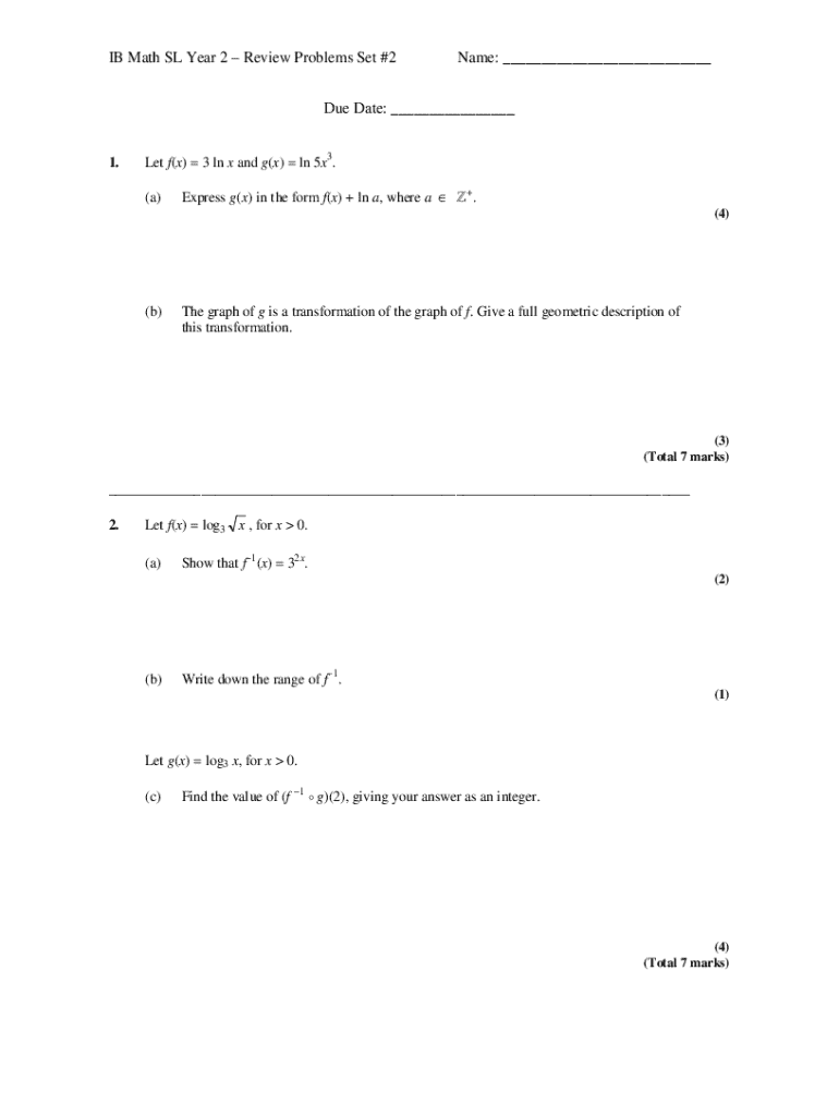 IB Math SL Year 2 Review Problems Set #2Name: ___Due Date: ___1.Let f(x) 3 ln x and g(x) ln 5x3. (a)Express g(x) in the form f(x) + ln a, where a +. (4)(b)The graph of g is a transformation of the