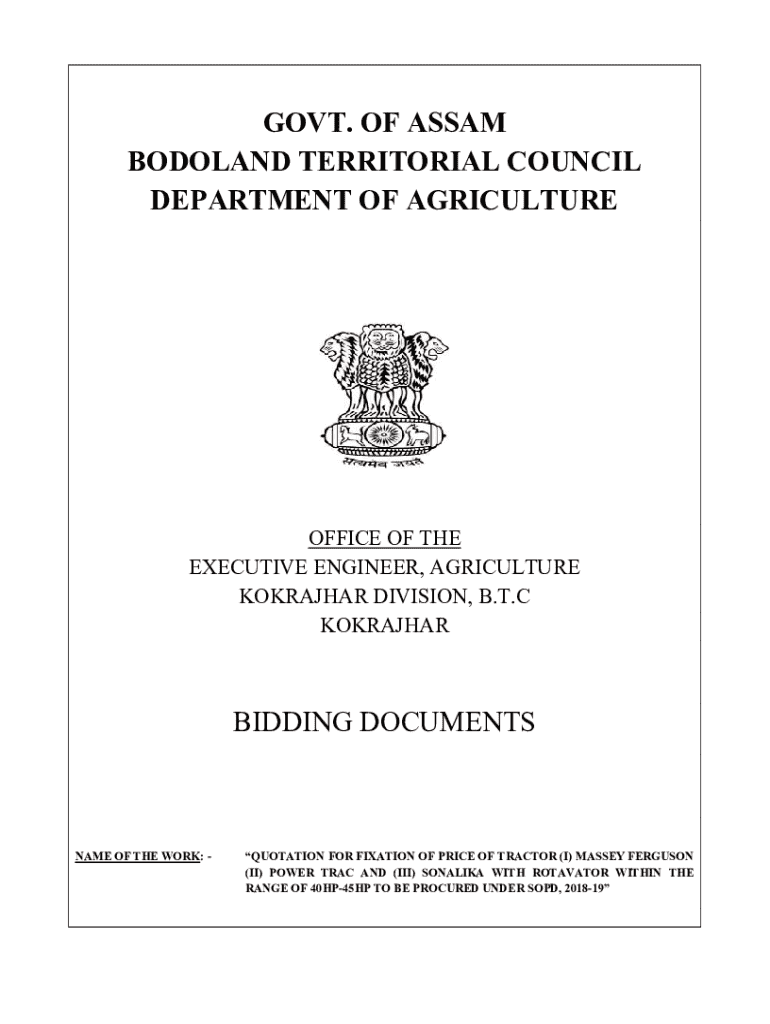This document is an invitation for quotations from registered vendors for the procurement of tractors (Massey Ferguson, Power Trac, and Sonalika) with rotavators, specifically in the range of 40HP-45HP, to be acquired under the SOPD for the financial year 2018-19 by the Bodoland Territorial Council, Government of Assam.