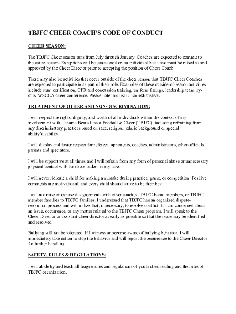 The TBJFC cheer coach's code is a set of guidelines and standards that coaches must adhere to in order to promote a positive and safe environment for cheerleading participants.