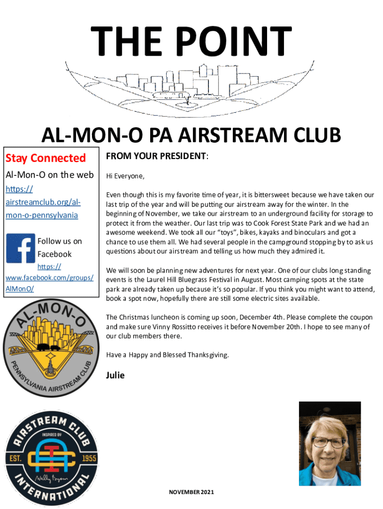 THE POINT ALMONO PA AIRSTREAM CLUB Stay ConnectedFROM YOUR PRESIDENT:AlMonO on the webHi Everyone,https:// airstreamclub.org/almonopennsylvania Follow us on Facebook https:// www.facebook.com/groups/