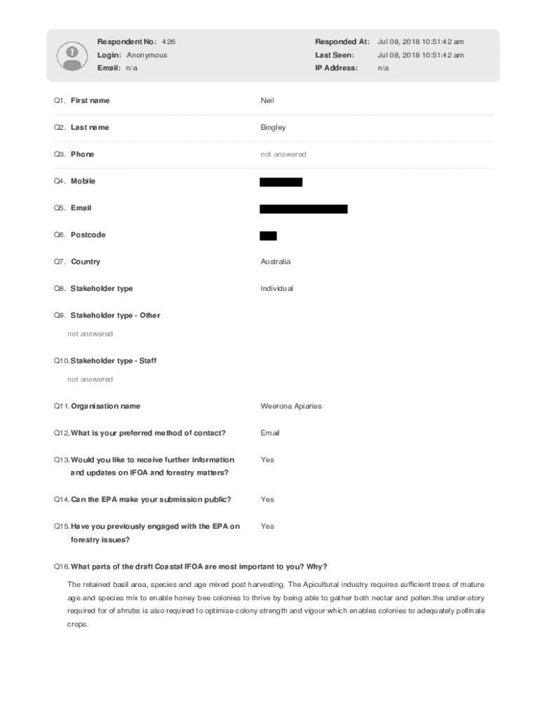 Respondent No: 426Responded At:Jul 08, 2018 10:51:42 amLogin: AnonymousLast Seen:Jul 08, 2018 10:51:42 amEmail: n/aIP Address:n/aQ1. First nameNeilQ2. Last nameBingleyQ3. Phonenot answeredQ4. Mobile