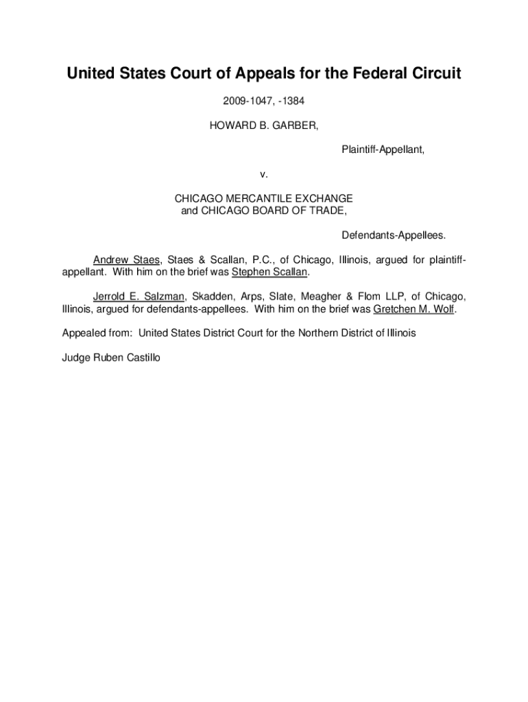This document is an appeal decision from the United States Court of Appeals for the Federal Circuit regarding a patent infringement complaint filed by Howard B. Garber against the Chicago Mercantile Exchange and the Chicago Board of Trade. The appeal addresses the denial of Garber\'s motion for relief from a prior court order, focusing on the interpretation of a stipulation for dismissal without prejudice and the jurisdiction of the district court over subsequent orders.
