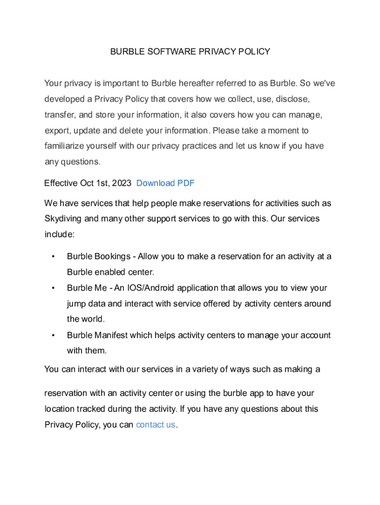 BURBLE SOFTWARE PRIVACY POLICY Your privacy is important to Burble hereafter referred to as Burble. So we\'ve developed a Privacy Policy that covers how we collect, use, disclose, transfer, and store