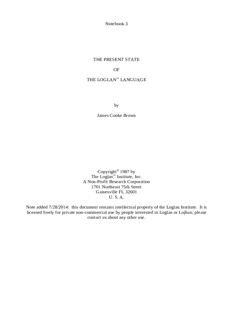 Notebook 3THE PRESENT STATE OF THE LOGLAN LANGUAGEby James Cooke BrownCopyright 1987 by The Loglan Institute, Inc. A NonProfit Research Corporation 1701 Northeast 75th Street Gainesville FL 32601 U. S. A. Note added 7/28/2014: this document remains intellectual property of the Loglan Institute. It is licensed freely for private noncommercial use by people interested in Loglan or Lojban; please contact us about any other use.PREFACE The present work is a revision and extension of