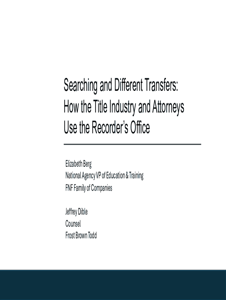 Searching and Different Transfers: How the Title Industry and Attorneys Use the Recorders Office Elizabeth Berg National Agency VP of Education & Training FNF Family of Companies Jeffrey Dible Counsel