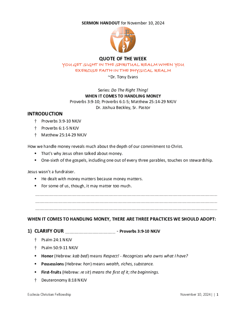 SERMON HANDOUT for November 10, 2024QUOTE OF THE WEEK YOU GET SIGHT IN THE SPIRITUAL REALM WHEN YOU EXERCISE FAITH IN THE PHYSICAL REALM Dr. Tony EvansINTRODUCTION Series: Do The Right Thing! WHEN