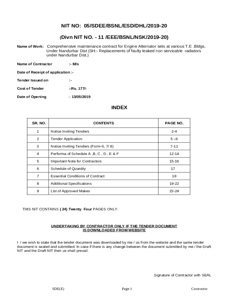 The Name of Work:Comprehensive maintenance contract for Engine Alternator sets at various T is a fillable form in MS Word extension required to be submitted to the relevant address in order to provide specific information. It must be completed and signed, which can be done in hard copy, or via a particular solution such as PDFfiller. It helps to fill out any PDF or Word document directly in your browser, customize it depending on your requirements and put a legally-binding electronic signature. Once after completion, user can easily send the Name of Work:Comprehensive maintenance contract for Engine Alternator sets at various T to the appropriate individual, or multiple individuals via email or fax. The blank is printable too because of PDFfiller feature and options offered for printing out adjustment. Both in electronic and in hard copy, your form should have a neat and professional look. It's also possible to turn it into a template for later, so you don't need to create a new blank form from the beginning. You need just to edit the ready form.
