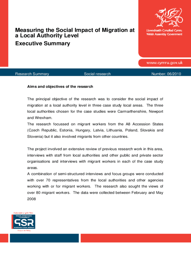 Measuring the Social Impact of Migration at a Local Authority Level Executive SummaryResearch SummarySocial researchNumber: 06/2010Aims and objectives of the researchThe principal objective of the
