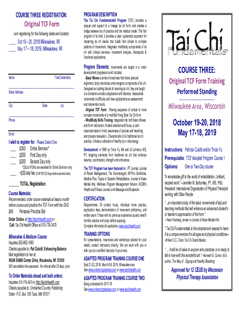 COURSE THREE REGISTRATION:Original TCF Form I am registering for the following dates and location:___ Oct 19 20, 2018 Milwaukee, WI ___ May 17 18, 2019, Milwaukee, WIPROGRAM DESCRIPTION The Tai Chi
