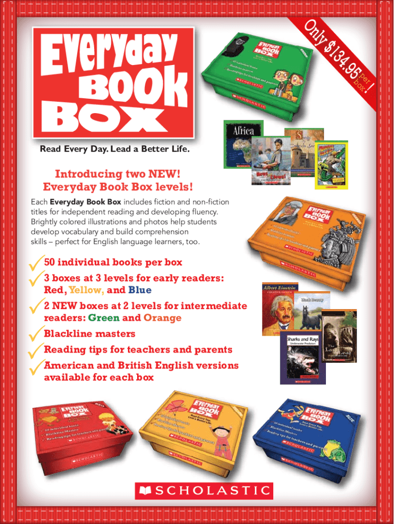 This document provides an overview of the Everyday Book Box program, including new box levels and options for independent reading material. It features a variety of fiction and non-fiction titles aimed at developing reading fluency and vocabulary, with illustrations to assist comprehension. The document also outlines ordering information and payment options.