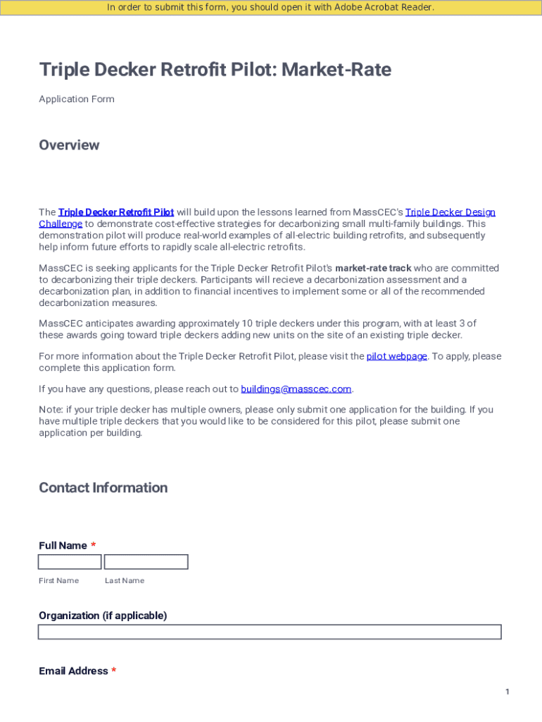 This application form is for applicants interested in participating in the Triple Decker Retrofit Pilot aimed at decarbonizing small multi-family buildings. It outlines the requirements for participation and provides sections for contact and project site information along with the necessary declarations.