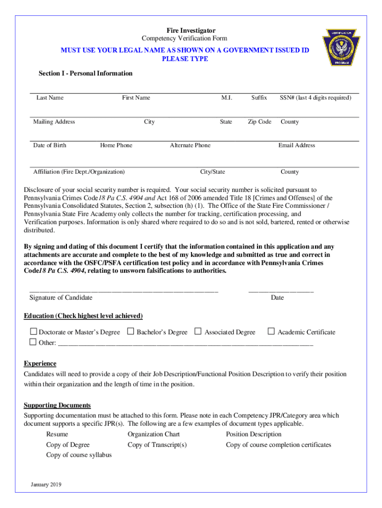 Fire Investigator Competency Verification Form MUST USE YOUR LEGAL NAME AS SHOWN ON A GOVERNMENT ISSUED ID PLEASE TYPE Section I Personal InformationLast NameFirst NameMailing AddressDate of BirthCityHome