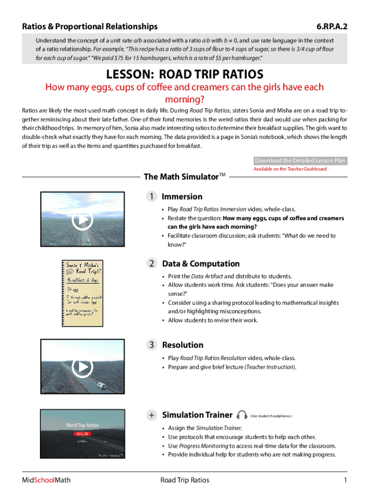 This document provides a lesson plan centered on understanding ratios and unit rates through a relatable context involving characters Sonia and Misha on a road trip, where they reflect on their father’s unique ratio planning for meals. The lesson includes activities for students to compute ratios related to breakfast supplies and encourages discussions on the use of rate language in problem-solving.