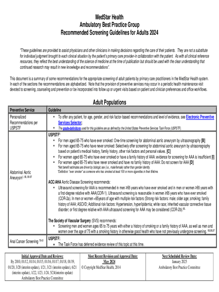 This document provides a summary of recommendations for appropriate screening of adult patients by primary care practitioners within the MedStar Health system. The guidelines assist clinicians in decision-making regarding patient care and emphasize the importance of individualized judgment in clinical situations. The document reflects current understanding of medicine based on research and guidelines from recognized authorities such as the USPSTF and various health organizations.