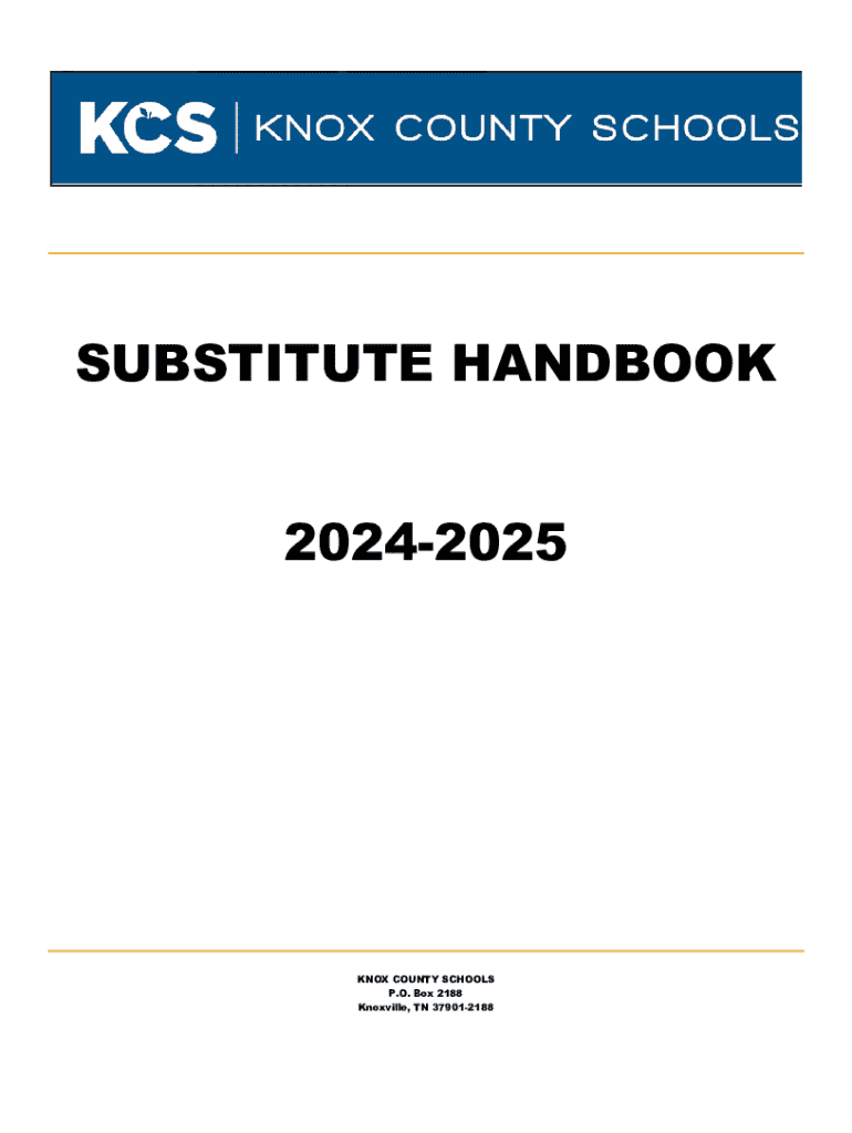 SUBSTITUTE HANDBOOK 20242025KNOX COUNTY SCHOOLS P.O. Box 2188 Knoxville, TN 379012188Table of Contents HUMAN RESOURCES STAFF3INTRODUCTION4MISSION STATEMENT4KNOX COUNTY SCHOOLS AT A GLANCE4ELIGIBILITY4ATWILL
