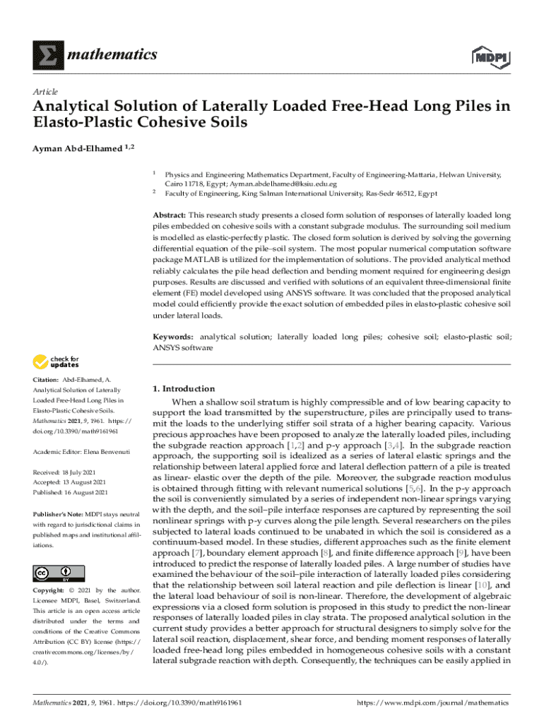 mathematics ArticleAnalytical Solution of Laterally Loaded FreeHead Long Piles in ElastoPlastic Cohesive Soils Ayman AbdElhamed 1,2 12Physics and Engineering Mathematics Department, Faculty of EngineeringMattaria,