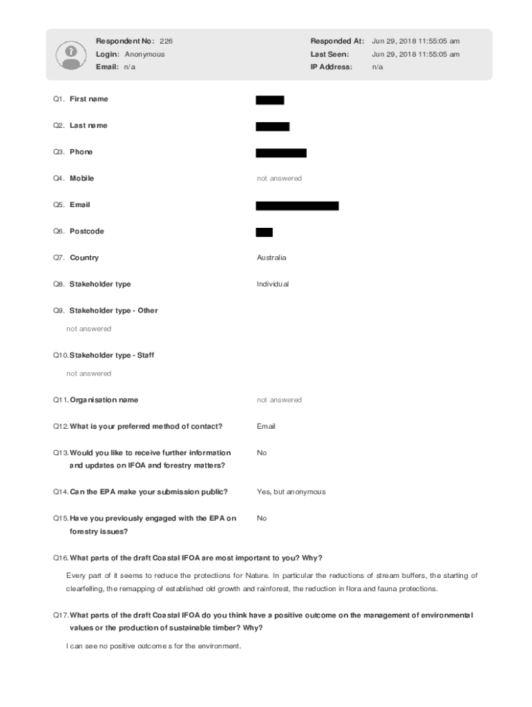 Respondent No: 226Responded At:Jun 29, 2018 11:55:05 amLogin: AnonymousLast Seen:Jun 29, 2018 11:55:05 amEmail: n/aIP Address:n/aQ1. First name Q2. Last name Q3. Phone Q4. Mobilenot answeredQ5. Email
