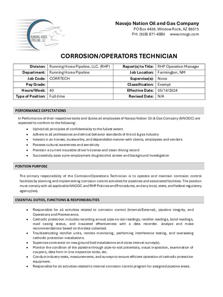 Navajo Nation Oil and Gas Company PO Box 4439, Window Rock, AZ 86515 PH: (928) 8714880 www.nnogc.comCORROSION/OPERATORS TECHNICIAN Division: Department: Job Code: Pay Grade: Hours/Week: Type of Position:Running