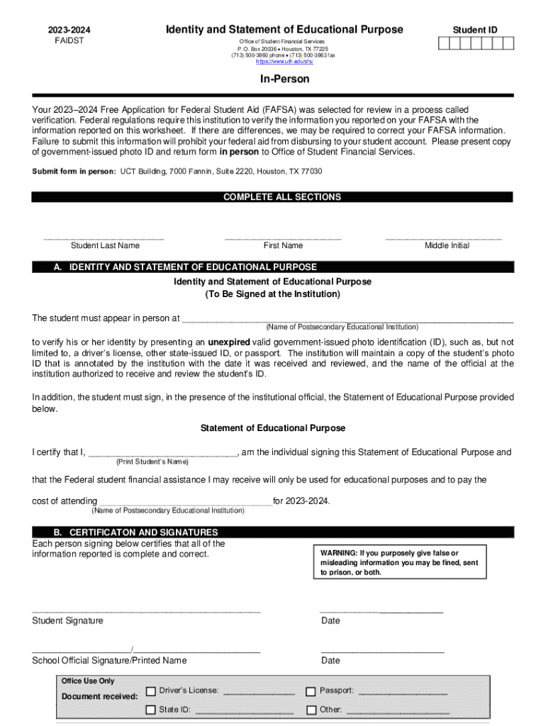 20232024Identity and Statement of Educational PurposeFAIDSTOffice of Student Financial Services P. O. Box 20036 Houston, TX 77225 (713) 5003860 phone (713) 5003863 fax https://www.uth.edu/sfs/Student