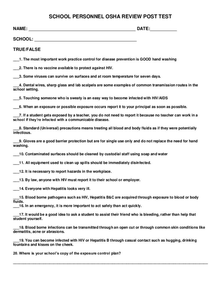This document is a post-test designed for school personnel to assess their understanding of OSHA guidelines related to health and safety practices, particularly concerning blood borne pathogens and disease prevention in a school environment.