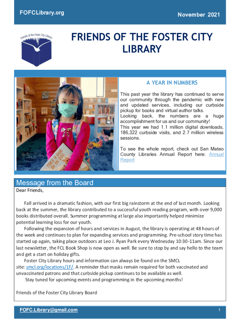 FOFCLibrary.orgNovember 2021FRIENDS OF THE FOSTER CITY LIBRARY A YEAR IN NUMBERS This past year the library has continued to serve our community through the pandemic with new and updated services,