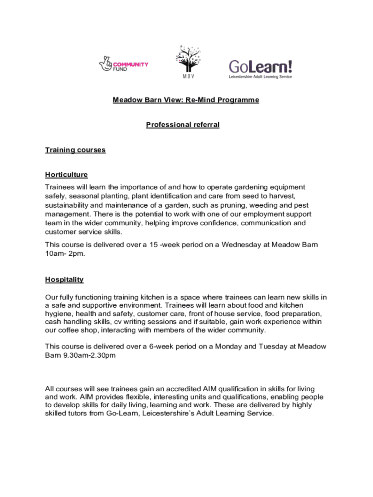 Meadow Barn View: ReMind Programme Professional referral Training courses Horticulture Trainees will learn the importance of and how to operate gardening equipment safely, seasonal planting, plant