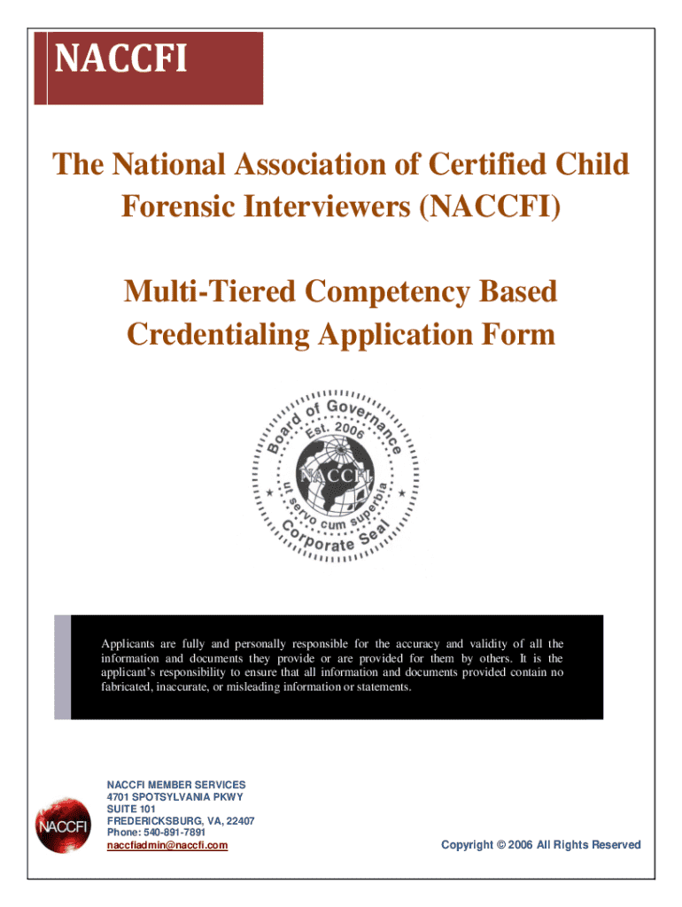 An application form for individuals seeking credentialing as certified child forensic interviewers through the National Association of Certified Child Forensic Interviewers (NACCFI). The document outlines the qualification standards, application procedures, and verification processes required for different levels of certification.