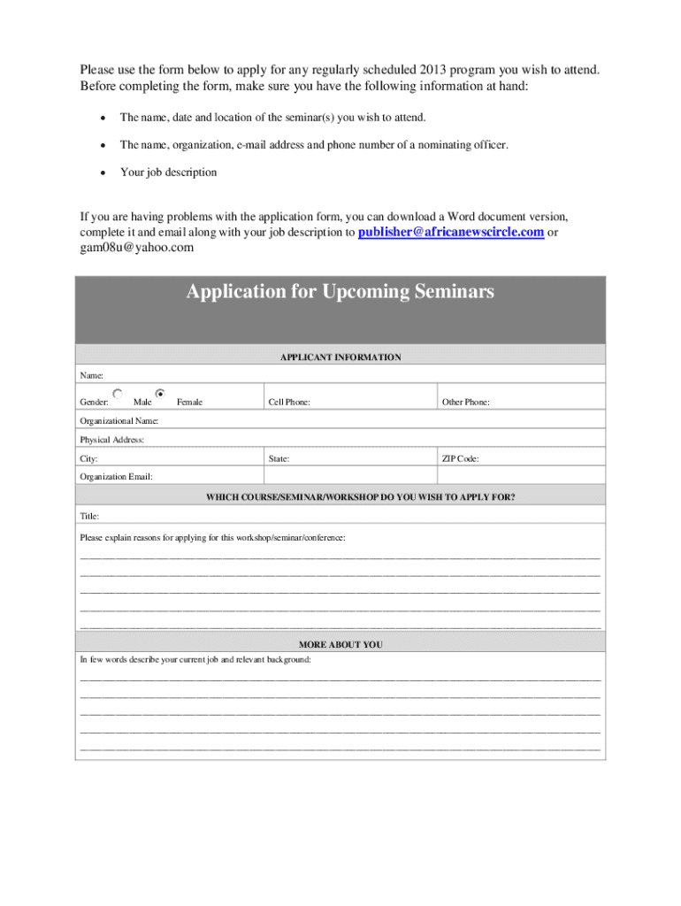Get the free Please use the form below to apply for any regularly scheduled 2013 program you wish...