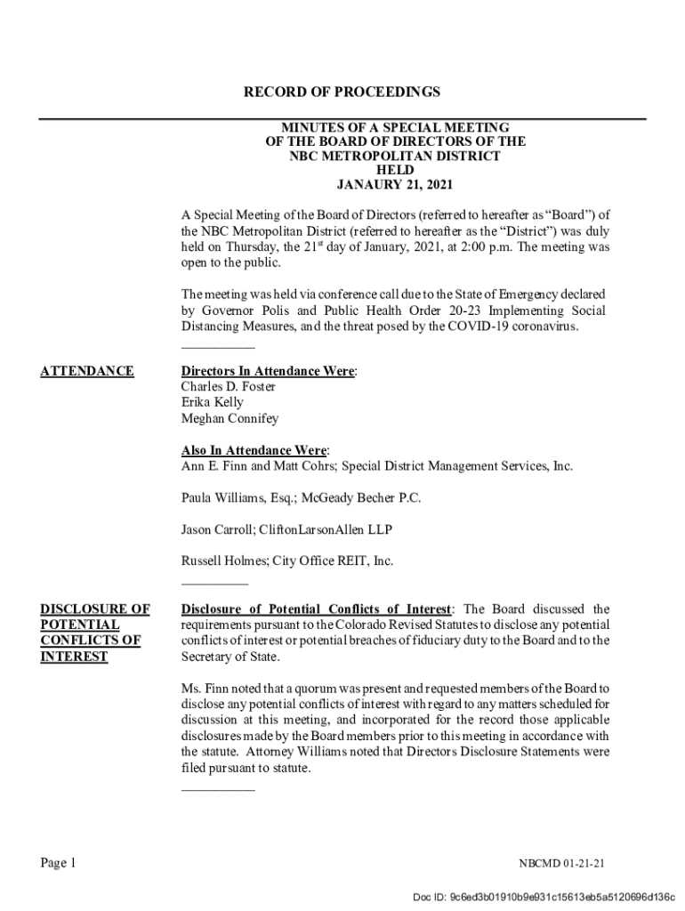RECORD OF PROCEEDINGS MINUTES OF A SPECIAL MEETING OF THE BOARD OF DIRECTORS OF THE NBC METROPOLITAN DISTRICT HELD JANAURY 21, 2021 A Special Meeting of the Board of Directors (referred to hereafter