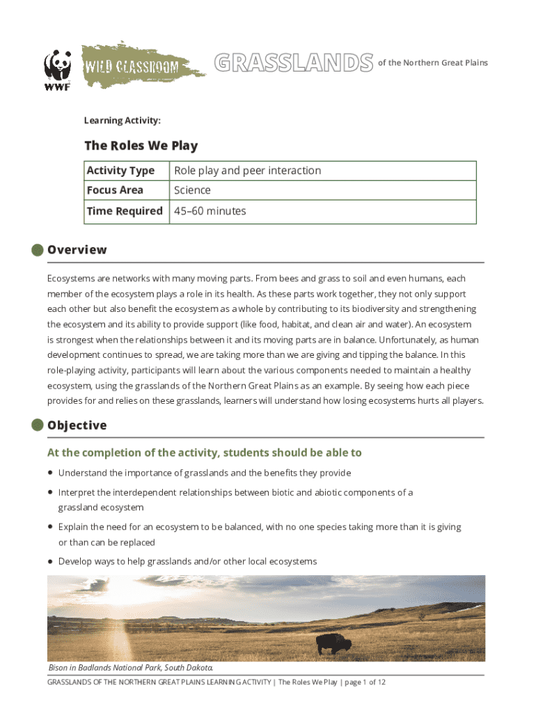 GRASSLANDSof the Northern Great PlainsLearning Activity:The Roles We Play Activity TypeRole play and peer interactionFocus AreaScienceTime Required 4560 minutesOverview Ecosystems are networks with