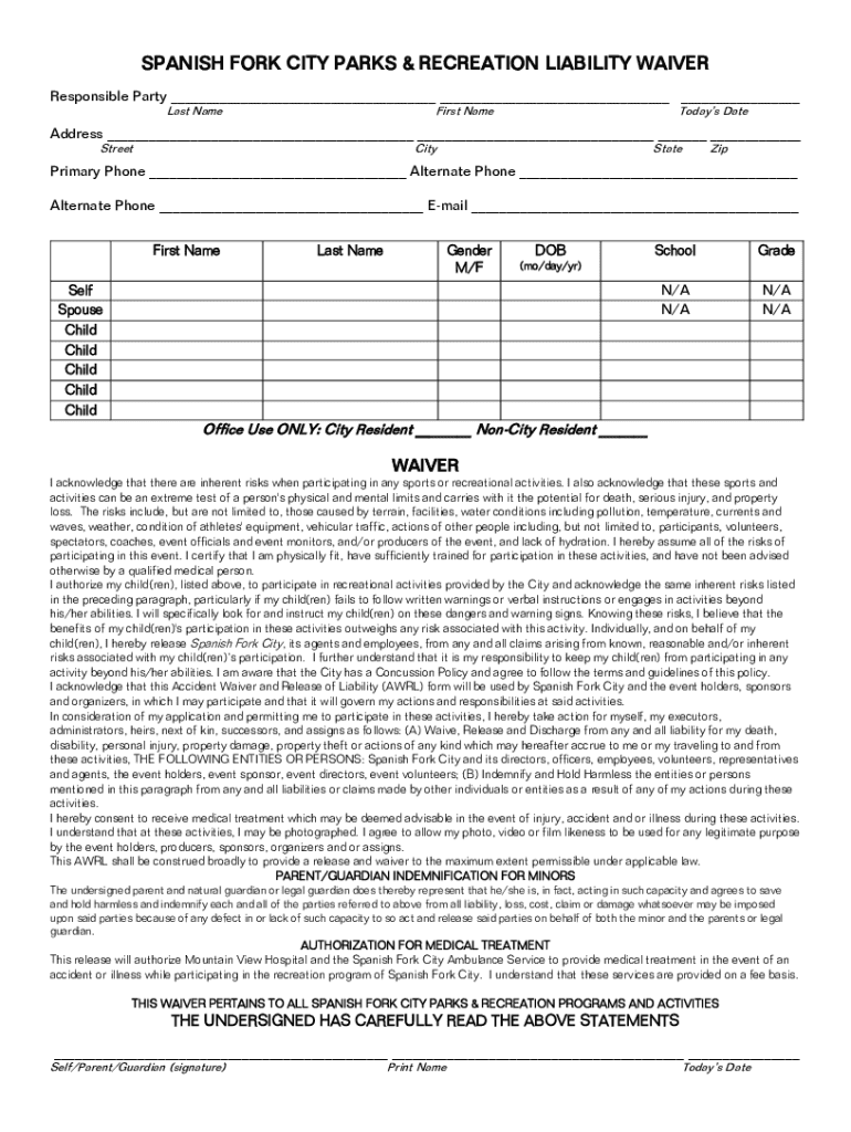 Get the free Spanish Fork City Parks & Recreation Liability Waiver