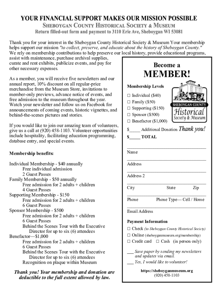 Thank you for your interest in the Sheboygan County Historical Society & Museum Your membership helps support our mission \"to collect, preserve, and educate about the history of Sheboygan County.\"