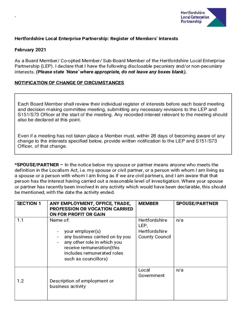 Hertfordshire Local Enterprise Partnership: Register of Members Interests February 2021 As a Board Member/ Coopted Member/ SubBoard Member of the Hertfordshire Local Enterprise Partnership (LEP).