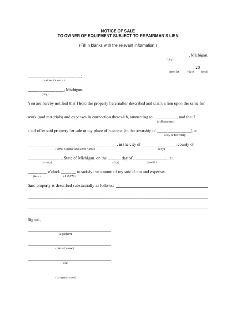 This document serves as a formal notice to the owner of equipment regarding the intent to sell their property due to a repairman\'s lien. It outlines the details of the lien, the sale process, and the relevant information necessary for the notification.