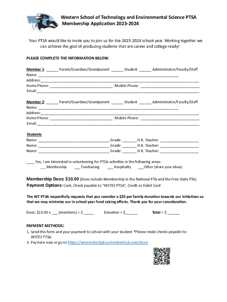 WeWestern School of Technology and Environmental Science PTSA Membership Application 20232024Your PTSA would like to invite you to join us for the 20232024 school year. Working together we can achieve