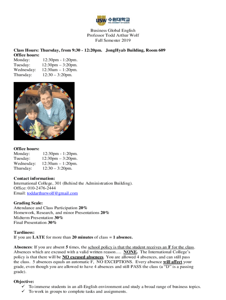 This document outlines the structure, requirements, and objectives of the Business Global English course taught by Professor Todd Arthur Wolf in the Fall Semester of 2019. The course aims to immerse students in an English-speaking environment while covering a range of business topics through group and individual presentations, research, and participation.