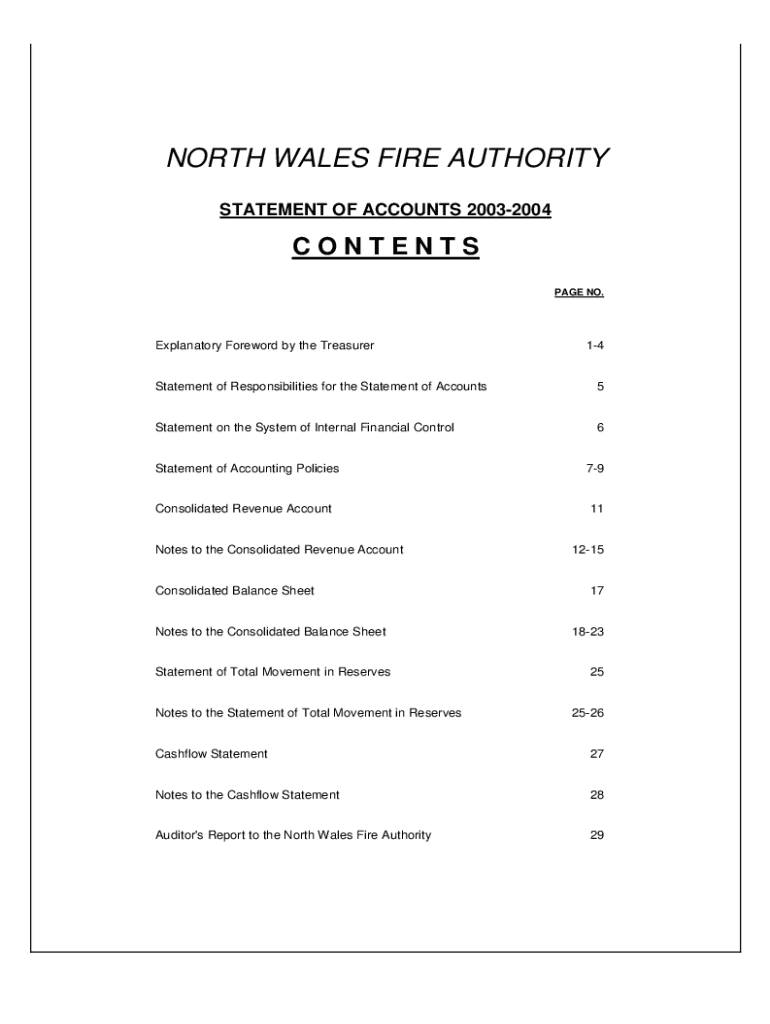 The Statement of Accounts provides a comprehensive overview of the financial position and performance of the North Wales Fire Authority for the financial year 2003-2004. It includes detailed statements such as the Consolidated Revenue Account, Consolidated Balance Sheet, and various supporting notes that illustrate the Authority\'s revenue expenditures, capital expenditures, and the management of financial resources. This document ensures compliance with relevant legal and accounting standards.